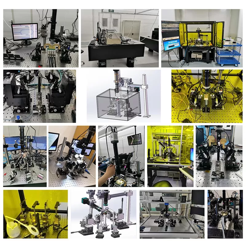 裸光纤输入输出与芯片精密对准(倾斜);实现光纤夹具75-82°;(定制)大范围调整,细调范围8°;平台可以兼容水平耦合,垂直阵列耦合等;中间芯片台可以支持PCB板和裸硅芯片最小步进50nm,半自动或者全自动。